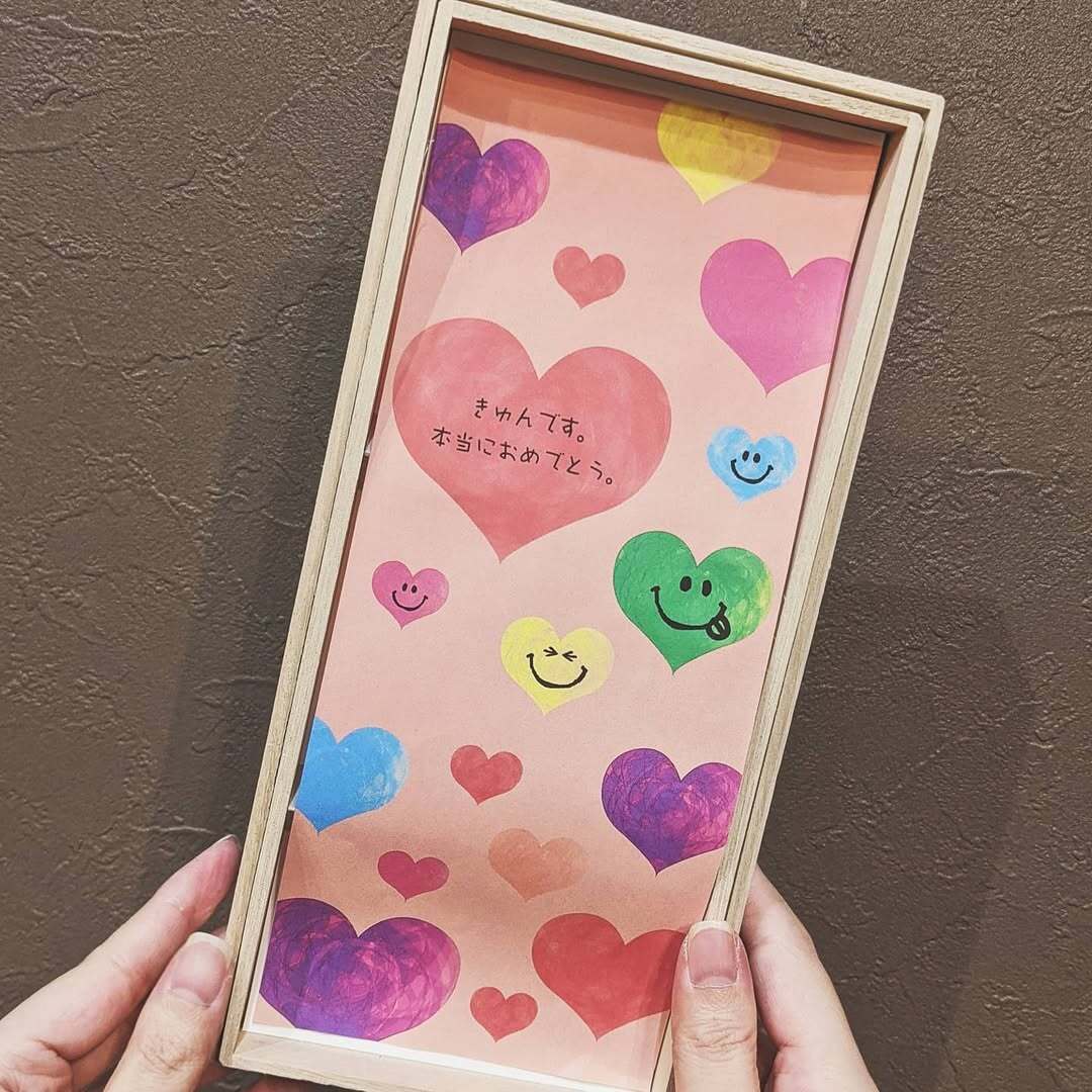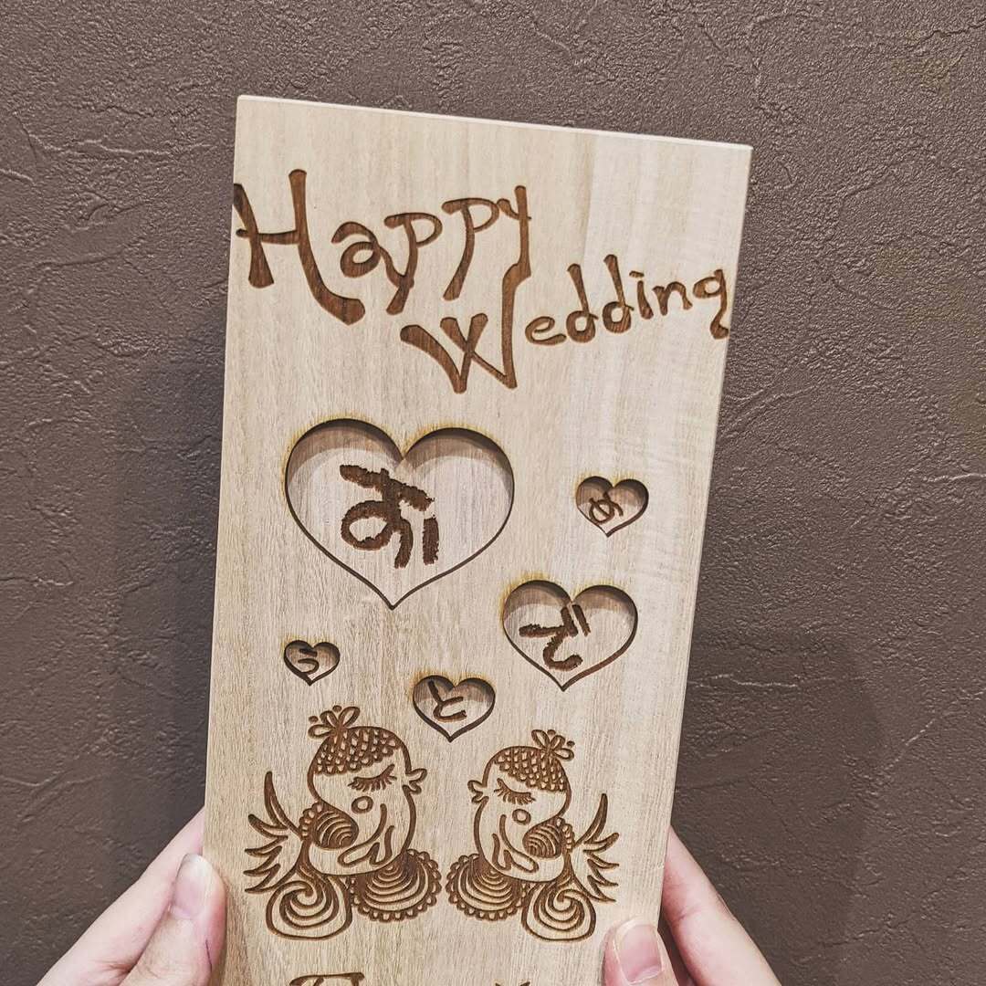 木箱にお名前と日付を刻めます。さらに台紙のメッセージも変更可能。