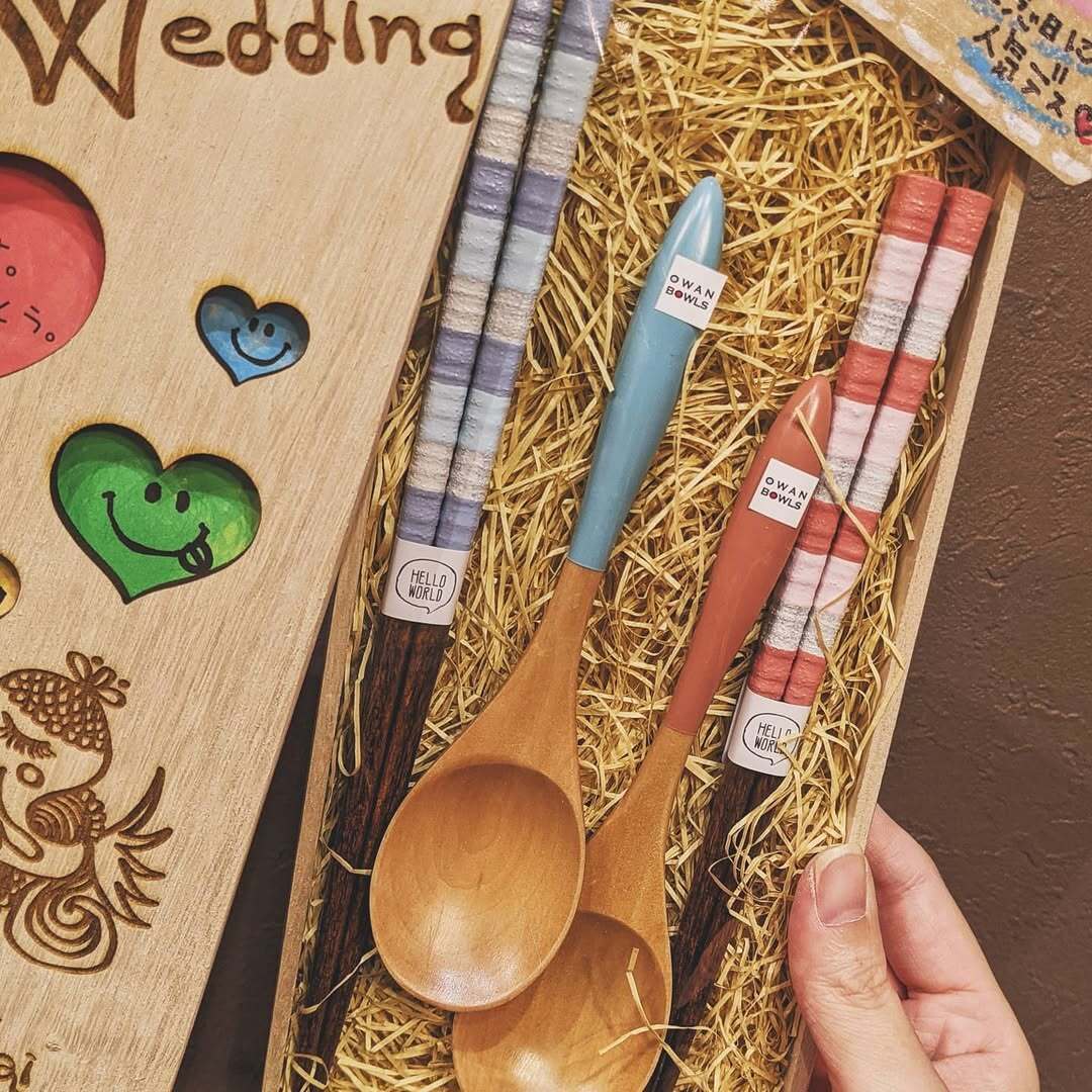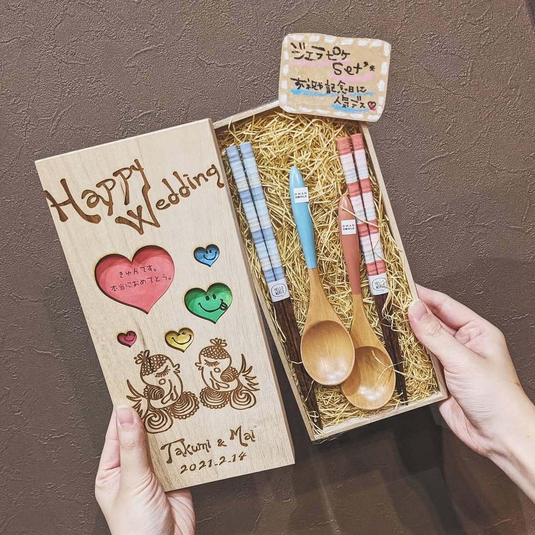 かわいいくりぬき木箱に夫婦箸+ペアスプーンのギフトセットです!