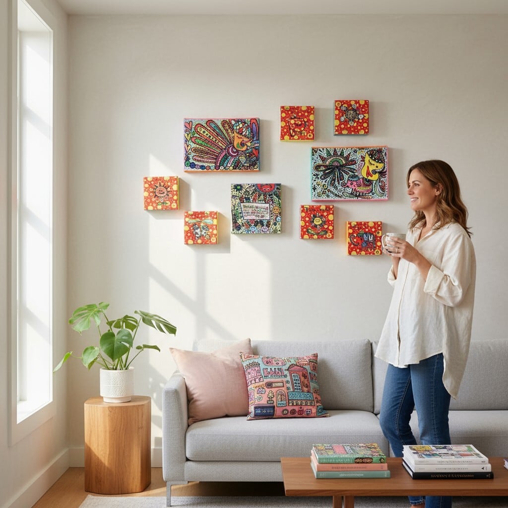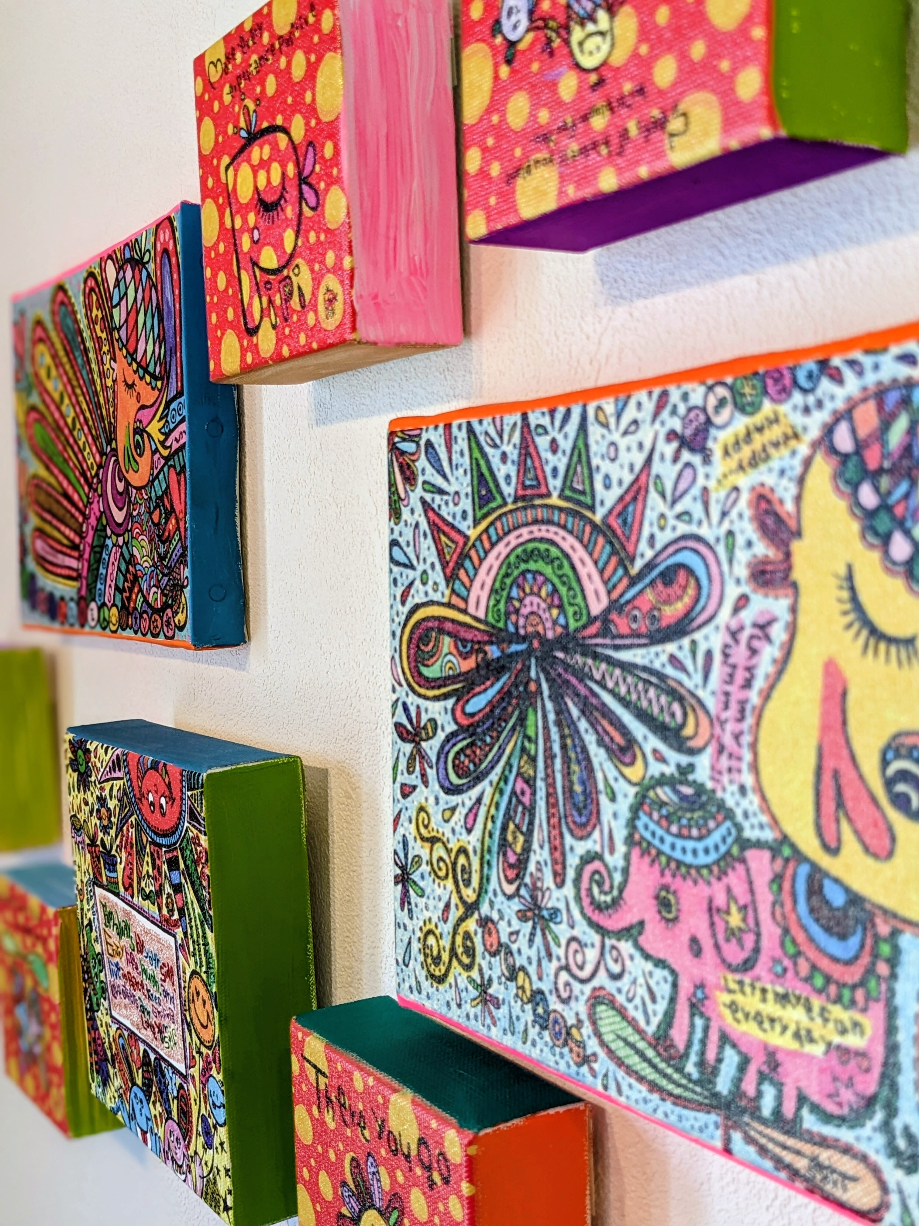 カラフルな手描きイラストを活かしたアートや雑貨を展開しています。
