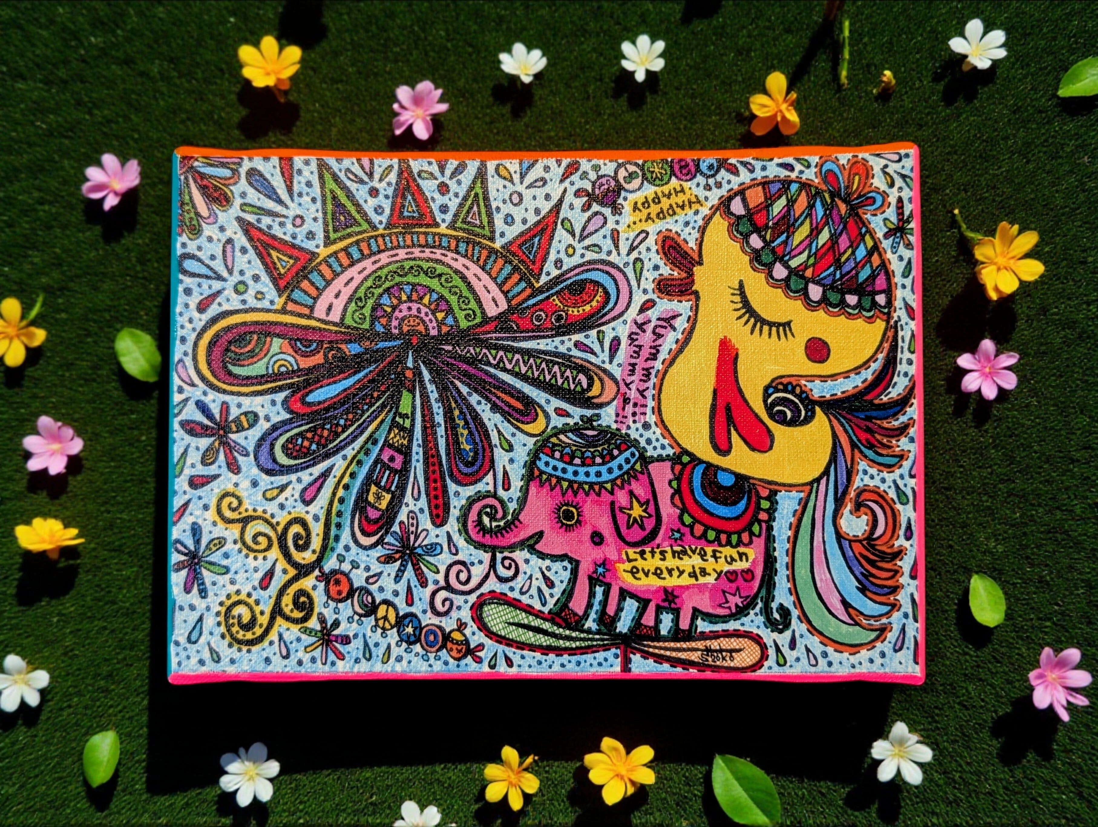 独創的な手描きイラストが鮮やかに映えるキャンバスは、飾るだけで空間を明るく彩ります。