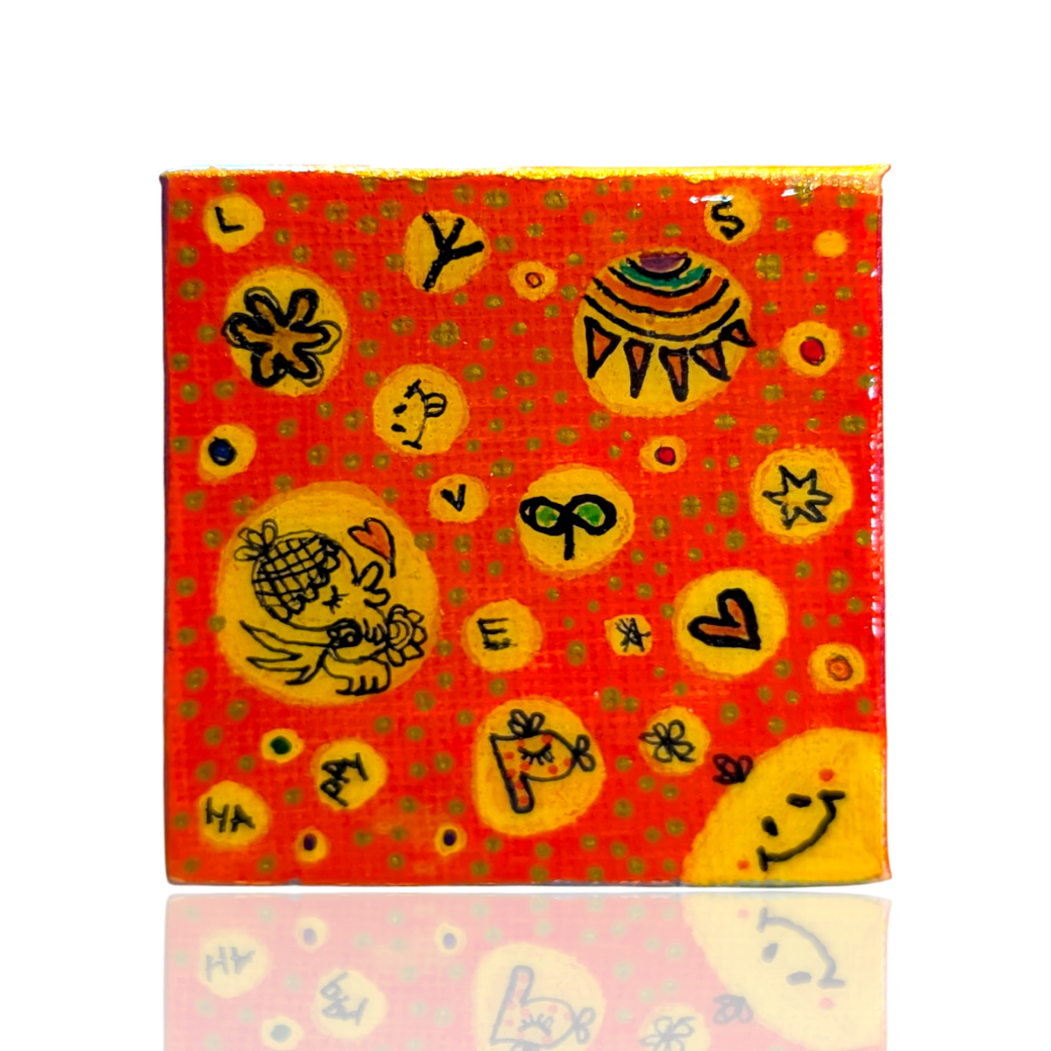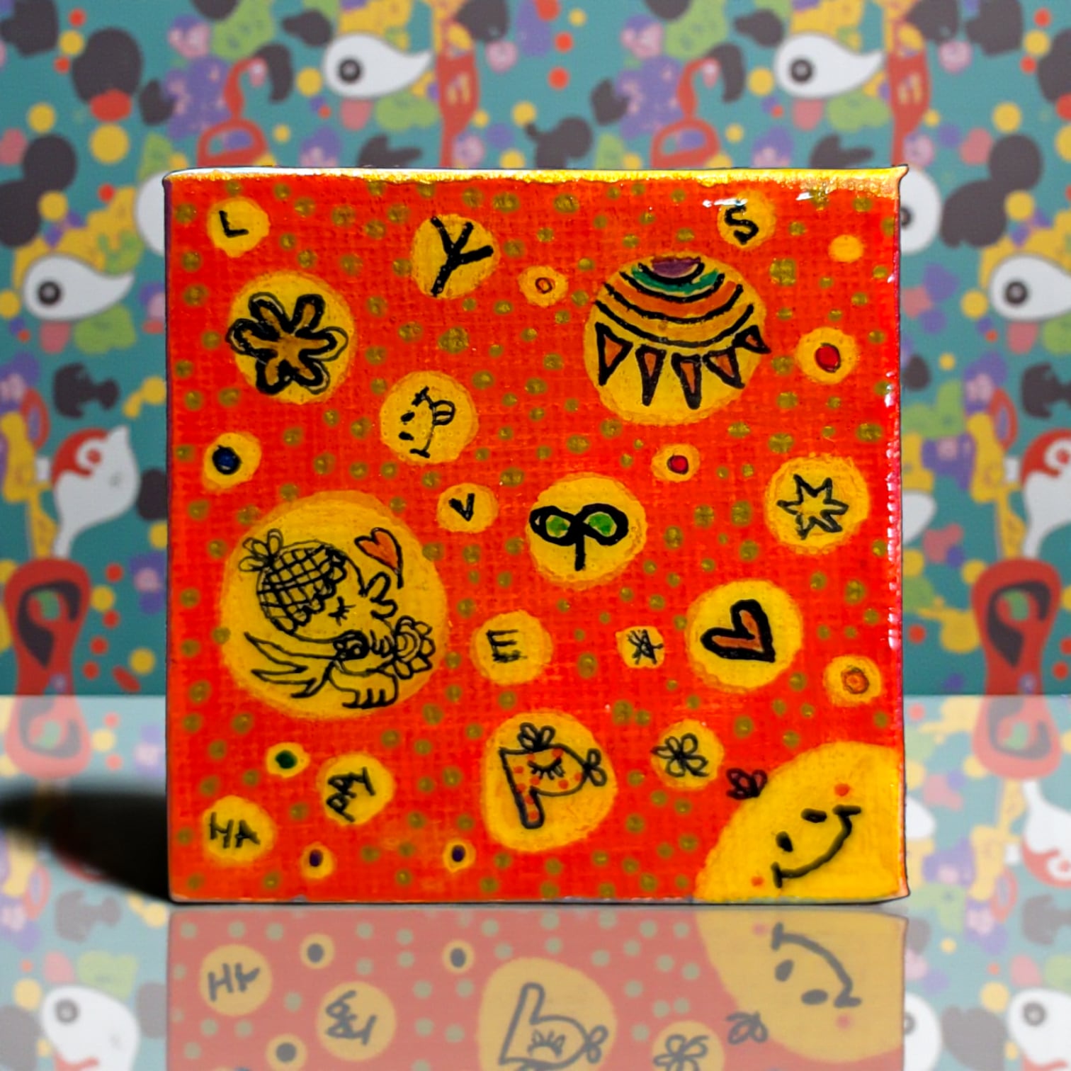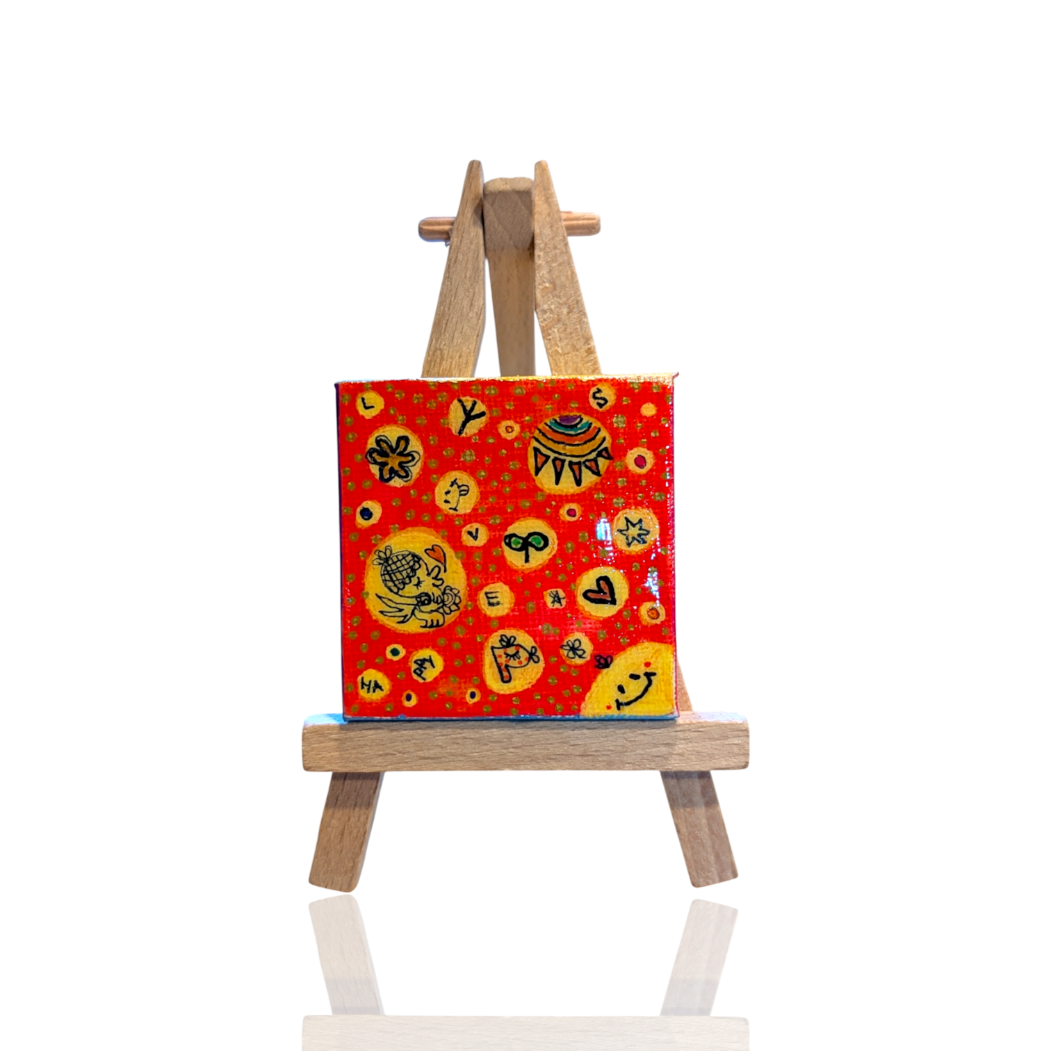 5センチ四方の小さなキャンバスの中に、前向きな気持ちになれる温かさと元気を込めています。