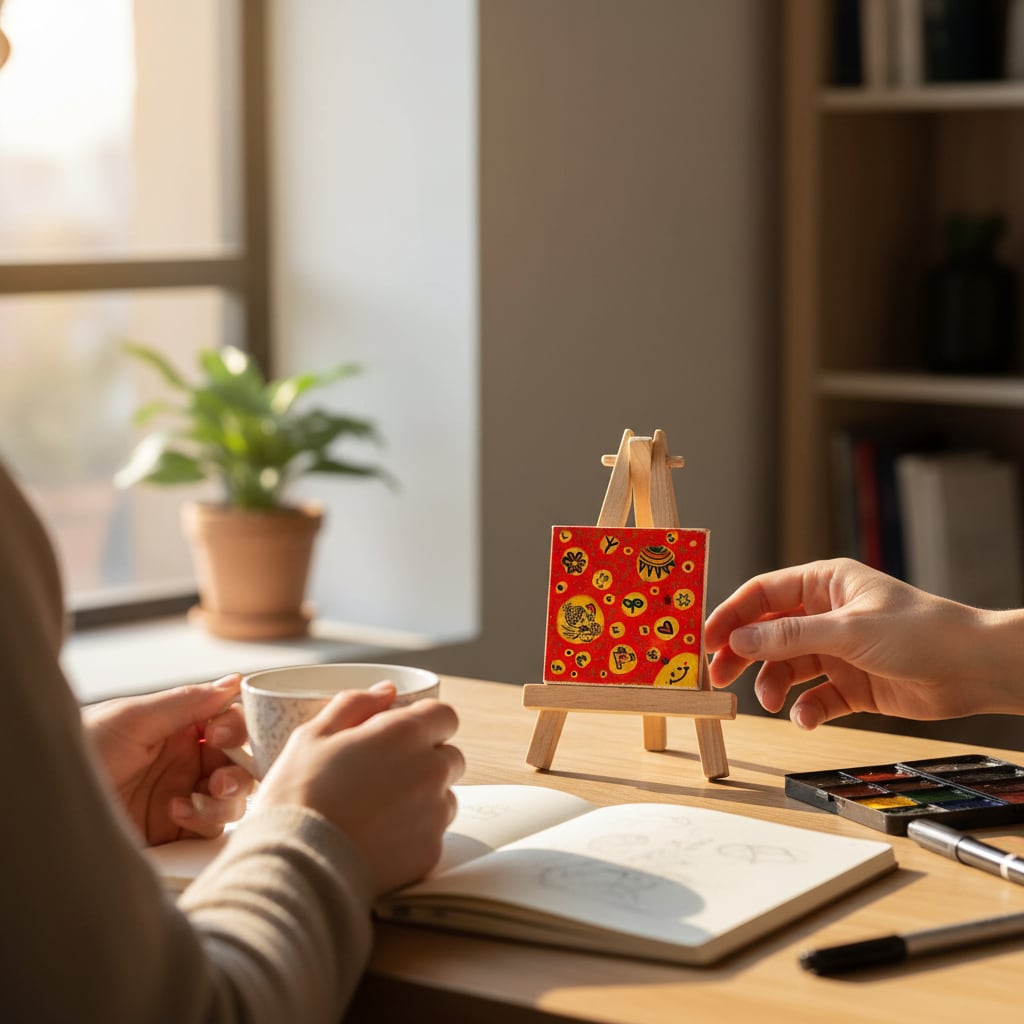 玄関、デスク、リビング、寝室などどこに置いても空間が明るくなる小さなアートです。