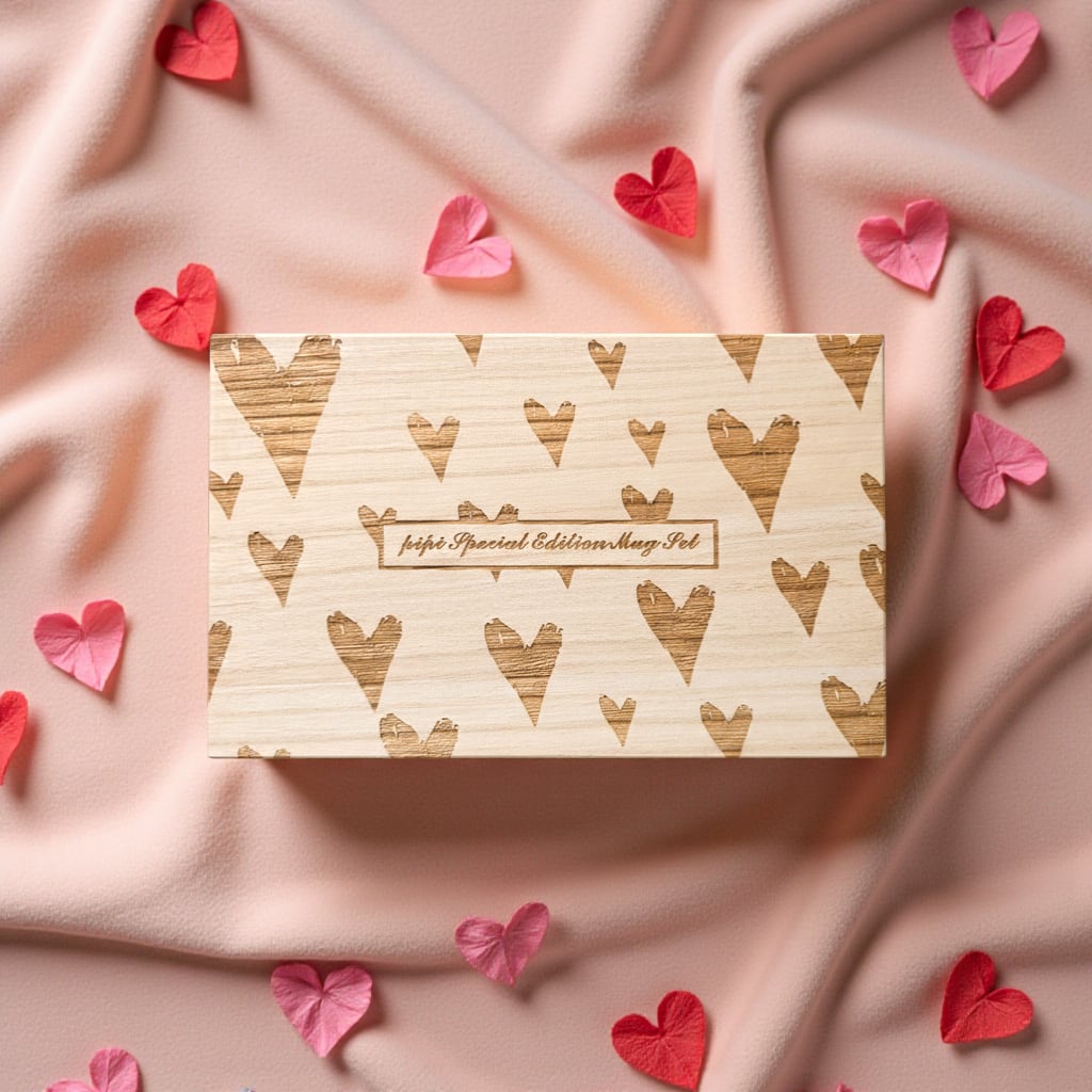 ハート柄があしらわれた、ペアマグ専用デザインの木箱入り。