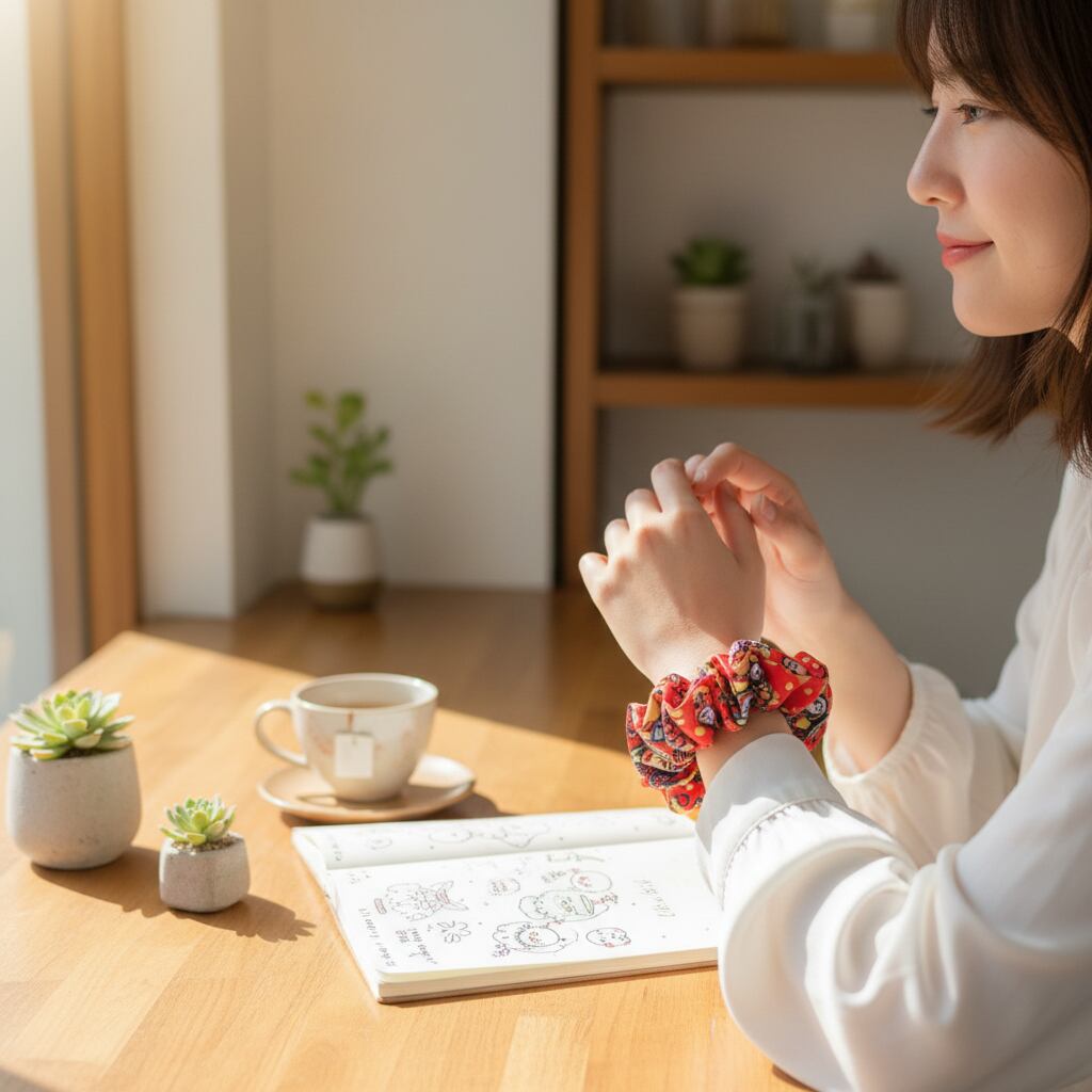 シンプルな服装にも映える主役級シュシュです。