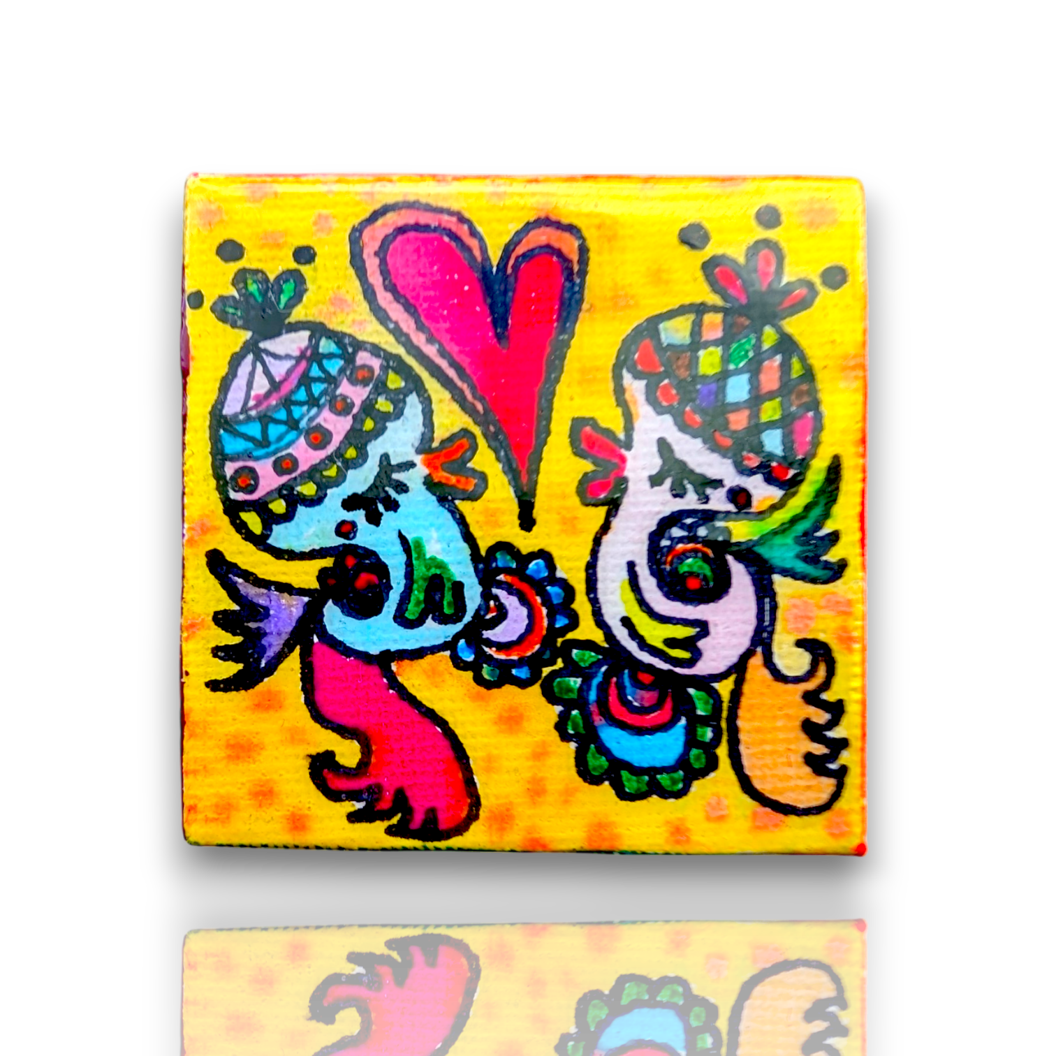 5センチ四方の小さなキャンバスの中に、前向きな気持ちになれる温かさと元気を込めています。