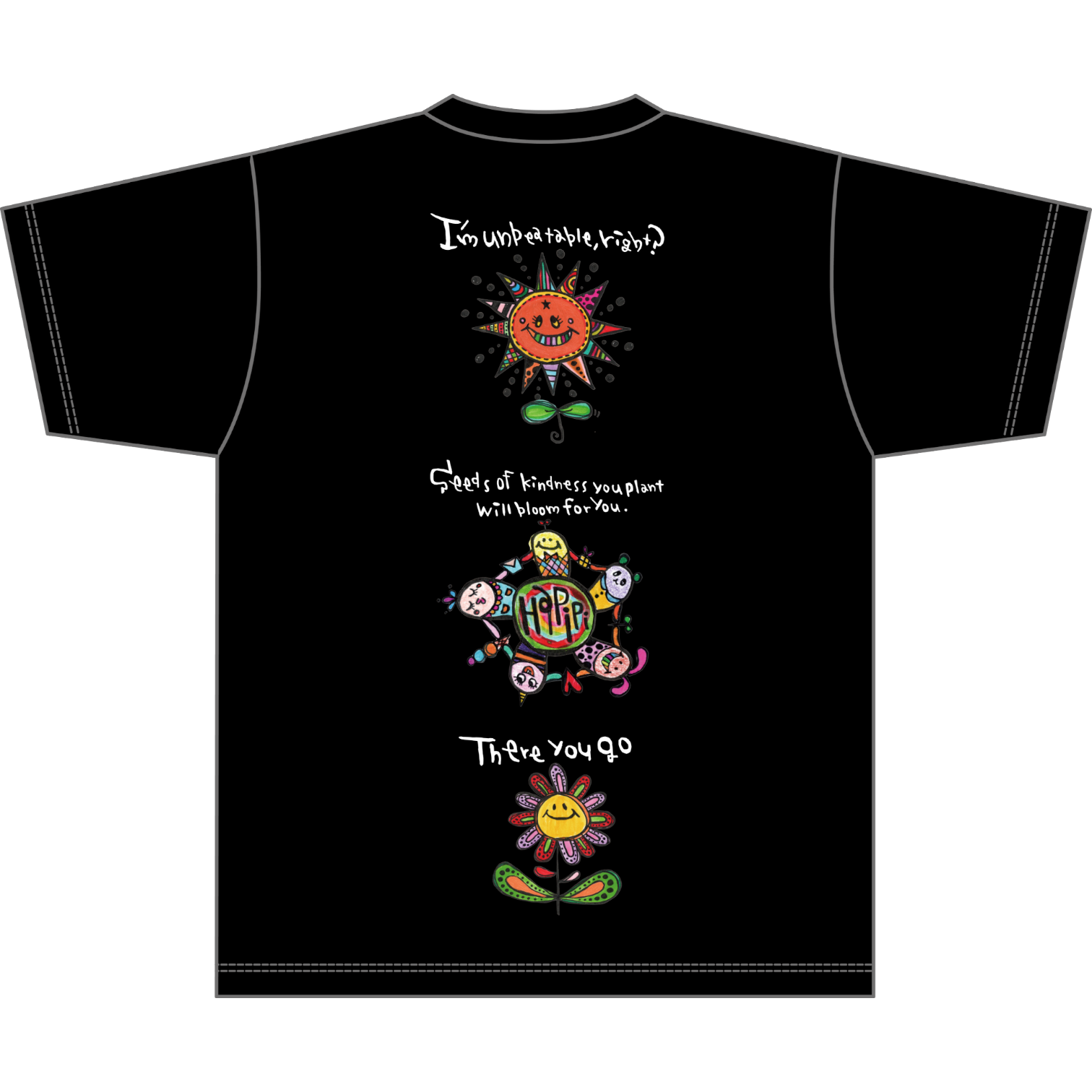 pipi人気のキャラクター3人がコラボしたTシャツ(わたし無敵でしょ?、ハピピ、ほらねっ☆)